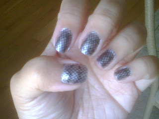 I forgot one Konadicure that I did...I tried the whole fishnet with lace thing but sadly it was a fail. :( I used Sally Hansen Pedal to the Metal for base colour and Wet n Wild Black Creme for stamping. I used image plates m57 and m36.