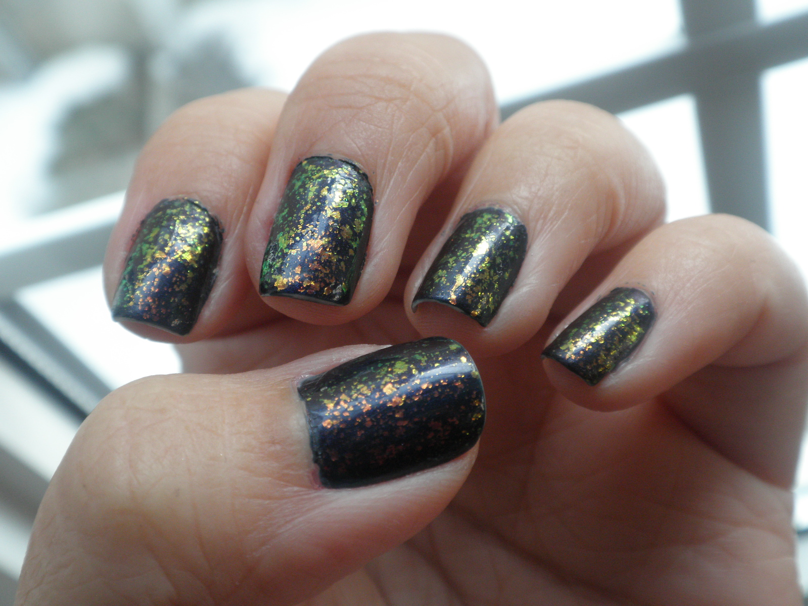 Both of these pictures were taken in natural light, no flash. Look at all the pretty flashing colours! Green, orange, a bit of gold...plus it all depends on what your base colour is. The last time I sported HT I wore it over CQ Mystical which is a purple and the flakies also flashed purple! I looooove HT and I wish I had a back-up bottle!